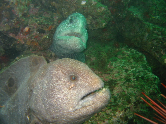 | I was lucky enough to get both male and female together. The male had gone back into the den after the female darted out to eat my camera housing. The explanation is that I had my camera lanyard around my wrist and I wanted to get it off and hook it to my BC so I could reach out with my hand. I set the camera down on a rock in front of me and the next thing I knew, the female had darted out of the den, straight for my camera. Part of the plastic on the Canon housing is orange, and the inside of the spiny urchin is also orange. I guess the wolf eel thought, "yum, urchin". It stopped before it bit my housing, but I was surprised to say the least. |